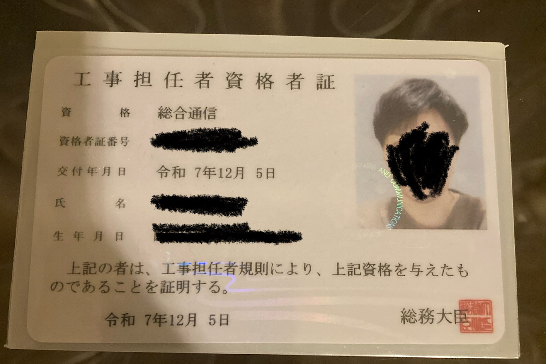 免状はなかなか高級感があります。あと何気に知事免許じゃなく、大臣免許なのも良い感じで耐久性もありそう。写真ではわかりにくいですが少しキラキラ波みたいな層があってなかなかオシャレです。子供の頃に集めていたビックリマンシールやsdガンダムのカードダスのキラキラシールを連想させます。