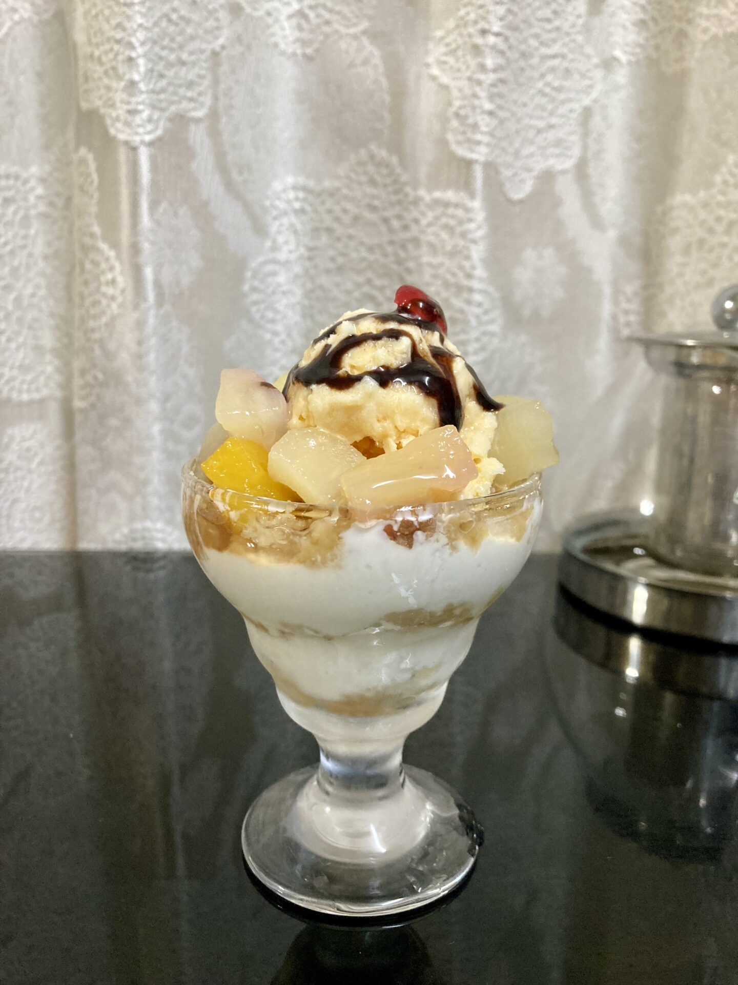 後は器の8分目辺りまで同様の作業を繰り返してラップをして冷蔵庫でコーヒーやラム酒が生地に浸透するまで2から3時間程待ちます。浸透後に1番上のアイスの層を作ります。バニラアイスを真ん中にのせてその隙間にフルーツの缶詰や果物をトッピングします。後はチョコシロップをアイスにかけたら完成です。トッピングはなんでもいいです。アイスをプリンにしたり、周りにホイップクリームやいちごなどを乗せたりご自身のお好きなもので!
