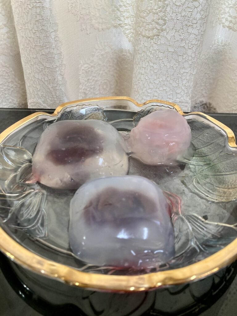 先程用意しておいた器を水で洗い器に水まんじゅうを半分まで流して丸くしておいたあんこを中心において、さらに水まんじゅうを8か9分目まで加えたら冷蔵庫で1時間30程冷やして完成。器から取り出す時は水を少し加えて爪楊枝で端をくり抜くような感にしてから器を裏返すと取り出しやすいです。水まんじゅうを器に入れる時も水洗いしておくとスムーズです。