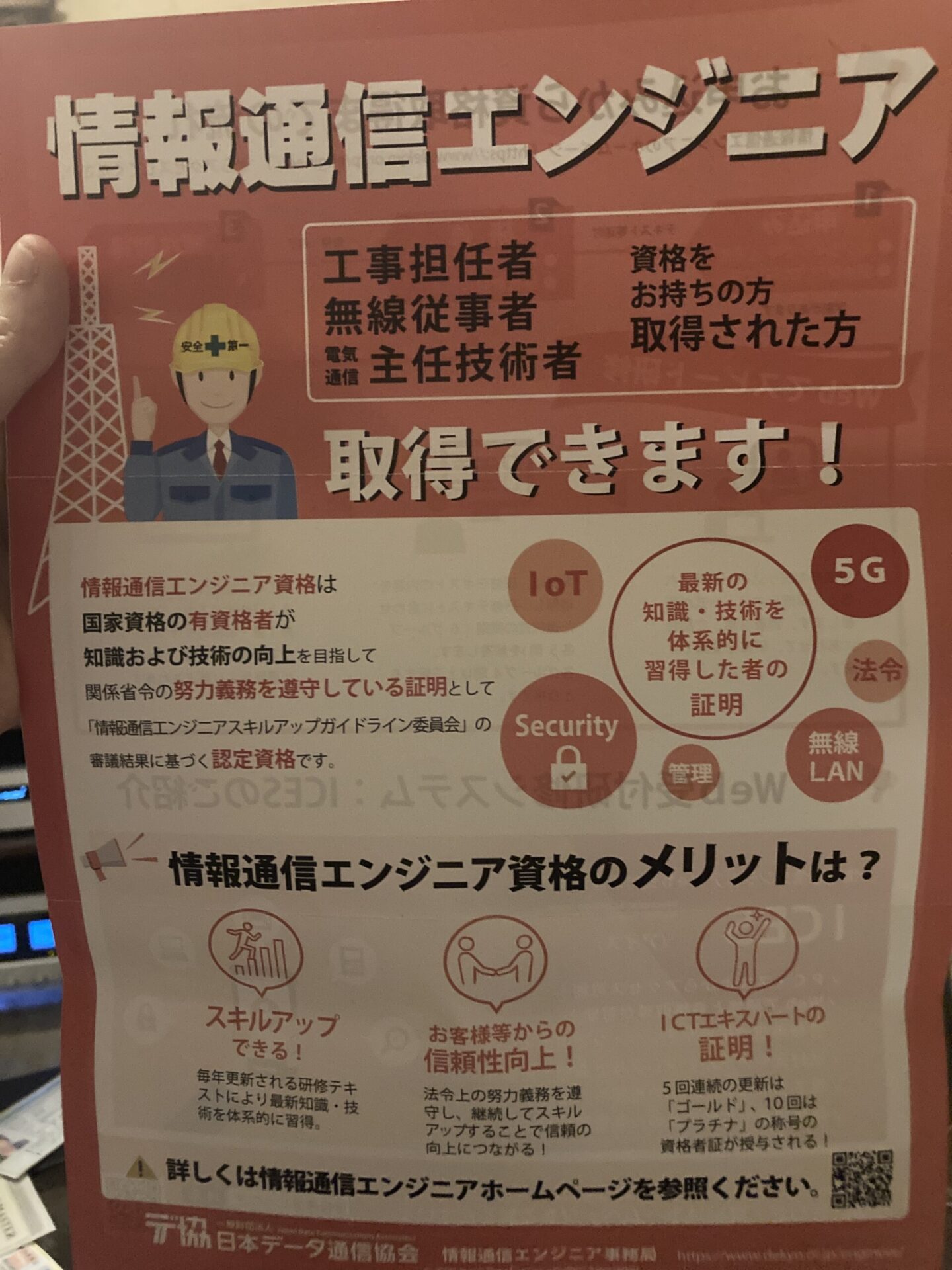 工事担任者総合通信に合格してウキウキで免状ができるのを待っていたのですが、なんか免状申請に必要な書類一式と一緒に情報通信エンジニアという資格のパンフレットが同梱されていました。