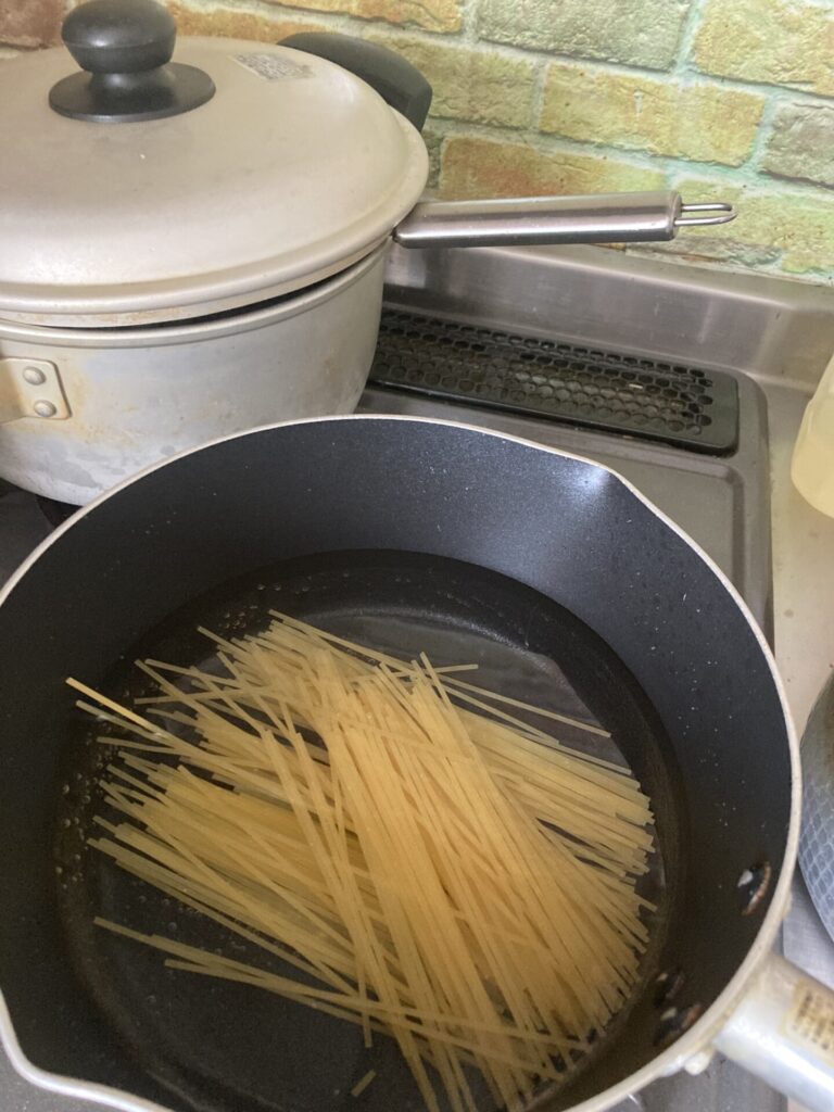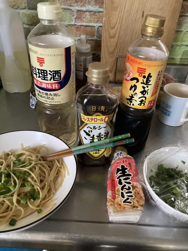パスタ(1人分)、料理酒(小さじ1)、ごま油(小さじ1、ニンニクチューブ(好みで)、ネギ、つゆの素などめんつゆの濃縮された製品(大さじ2位)