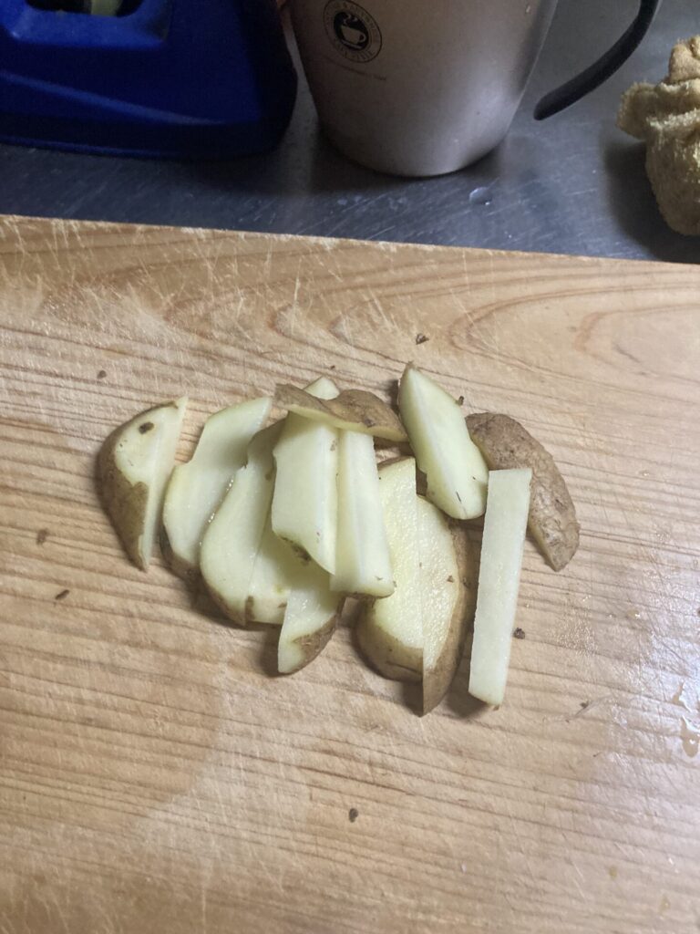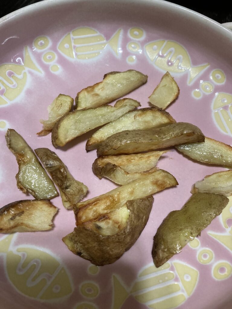 これは簡単でしかも美味しいです。材料はじゃがいも、塩、コンソメ、サラダ油、バター(好みで)と調理にノンフライヤーを使用します。