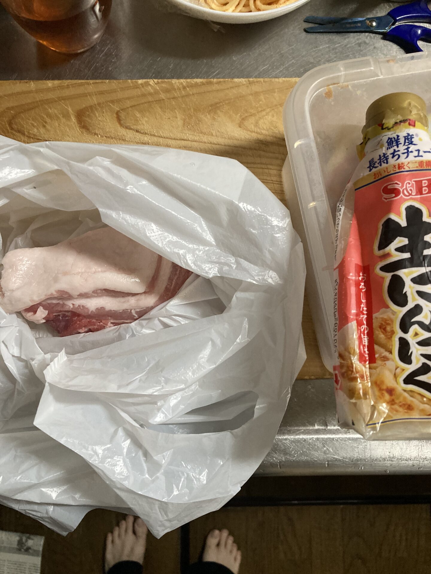 調味料を混ぜてふくろにブロック肉を入れて手揉みする。