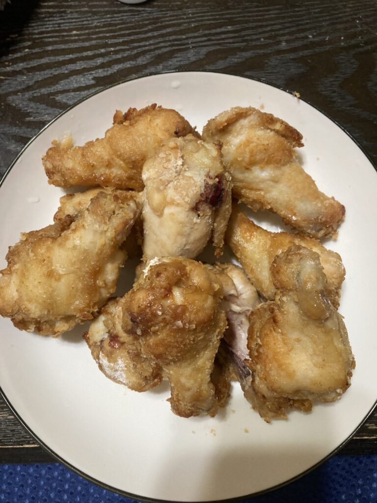 その後、片栗粉を前面にまんべんなくまぶしてノンフライヤーに180度で15分焼きます。途中で裏返しはしてください。少し粉が残っていても大丈夫です。