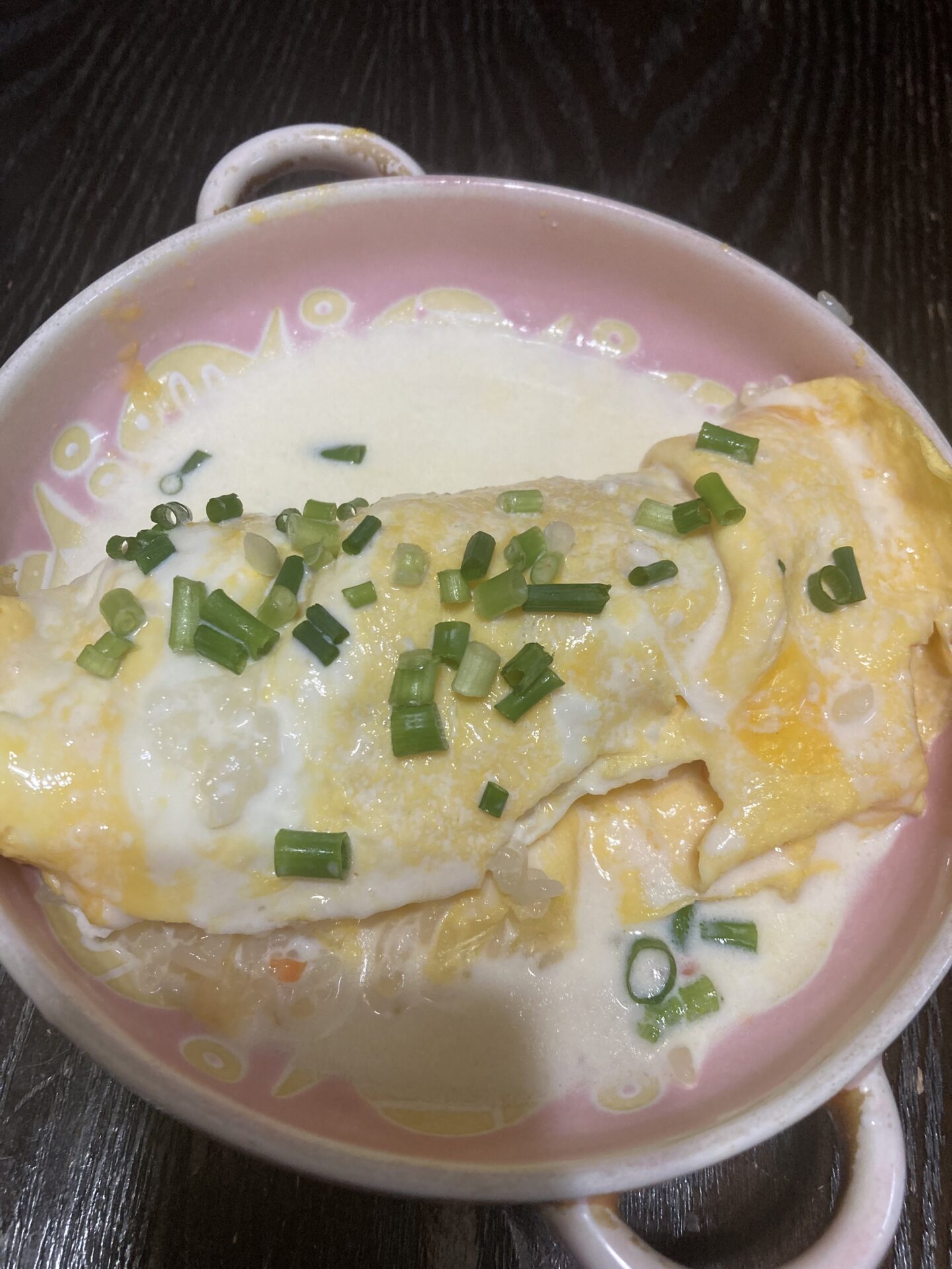 卵2個をほんの少し牛乳を加えてときます。円形の鍋で卵。火にかけて固形になったら端の方を隙間を作って裏返した時に落ちるようにしておきます。皿の中心に上から落ちるように卵を皿に乗せます。先程作ったバターライスを適量卵の真ん中に乗せて卵の端から包み込みます。