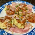 パンが焼けたら先程の目玉焼きとひき肉のパテを乗せて余ったソースを塗ったら完成。