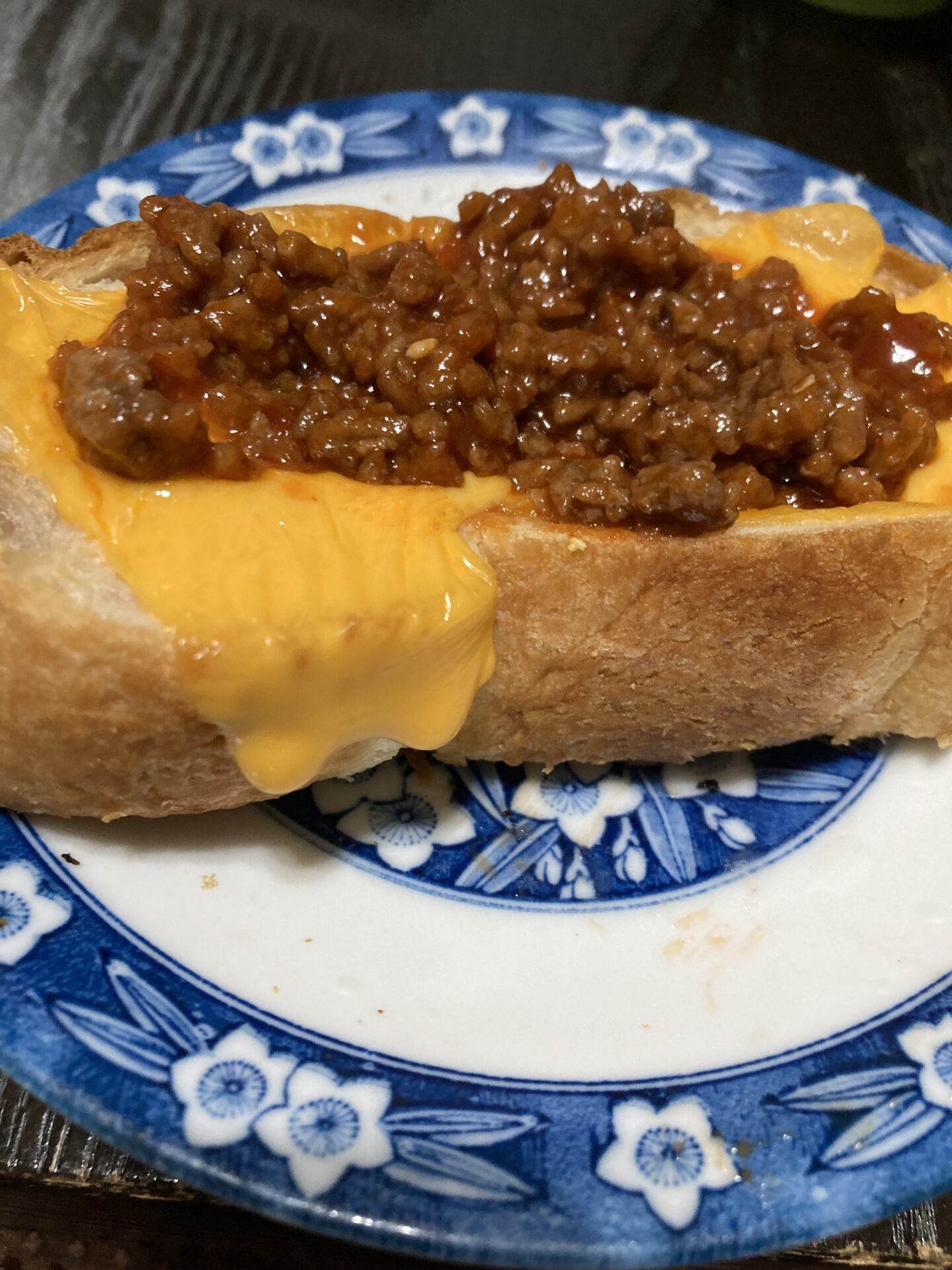 パンにチェダーチーズを乗せてトースターなどで焼いている間に合挽き肉を炒め、色に赤みがなくなったら玉ねぎとケチャップ多めとウスターソースとニンニクチューブ少量混ぜながら火にかけた後にチリソースとレモン汁少量混ぜて完成。